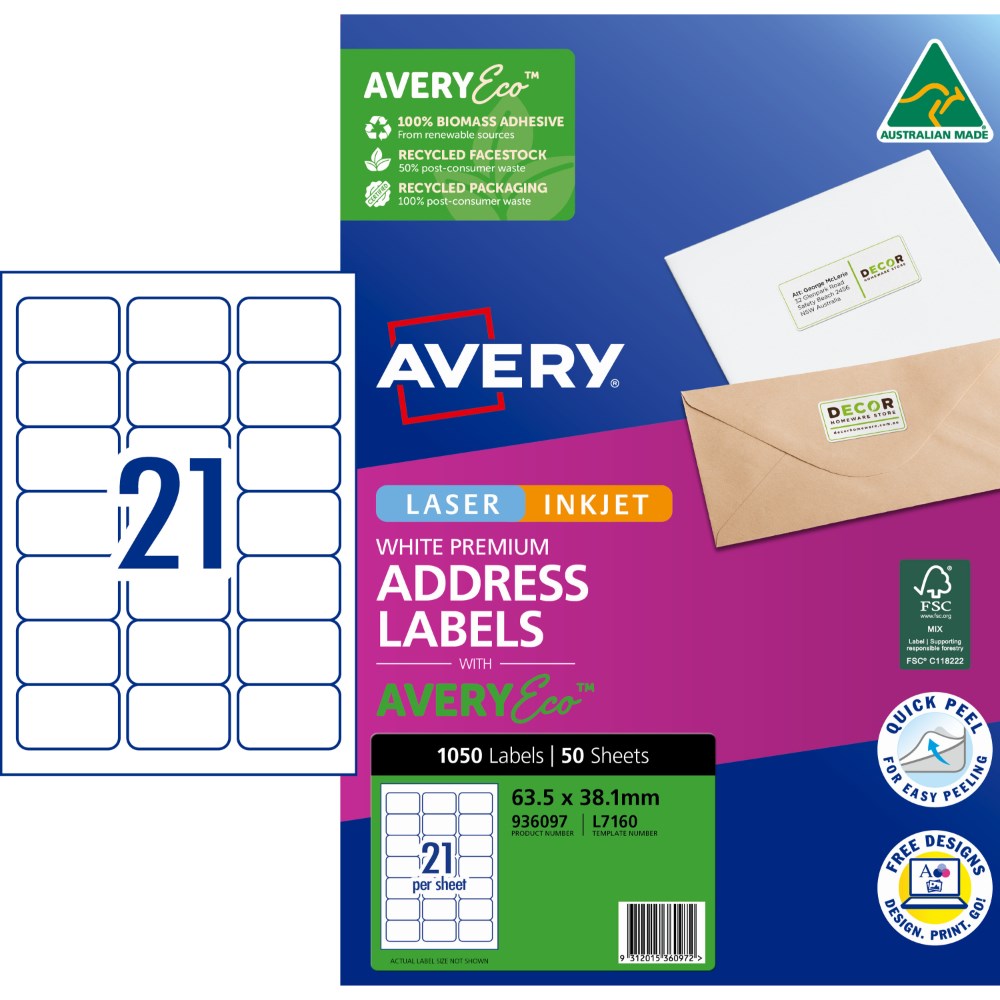 Avery Premium Address Labels White Laser Inkjet AveryEco L7160 63.5x38.1mm 21UP 1050 Lb