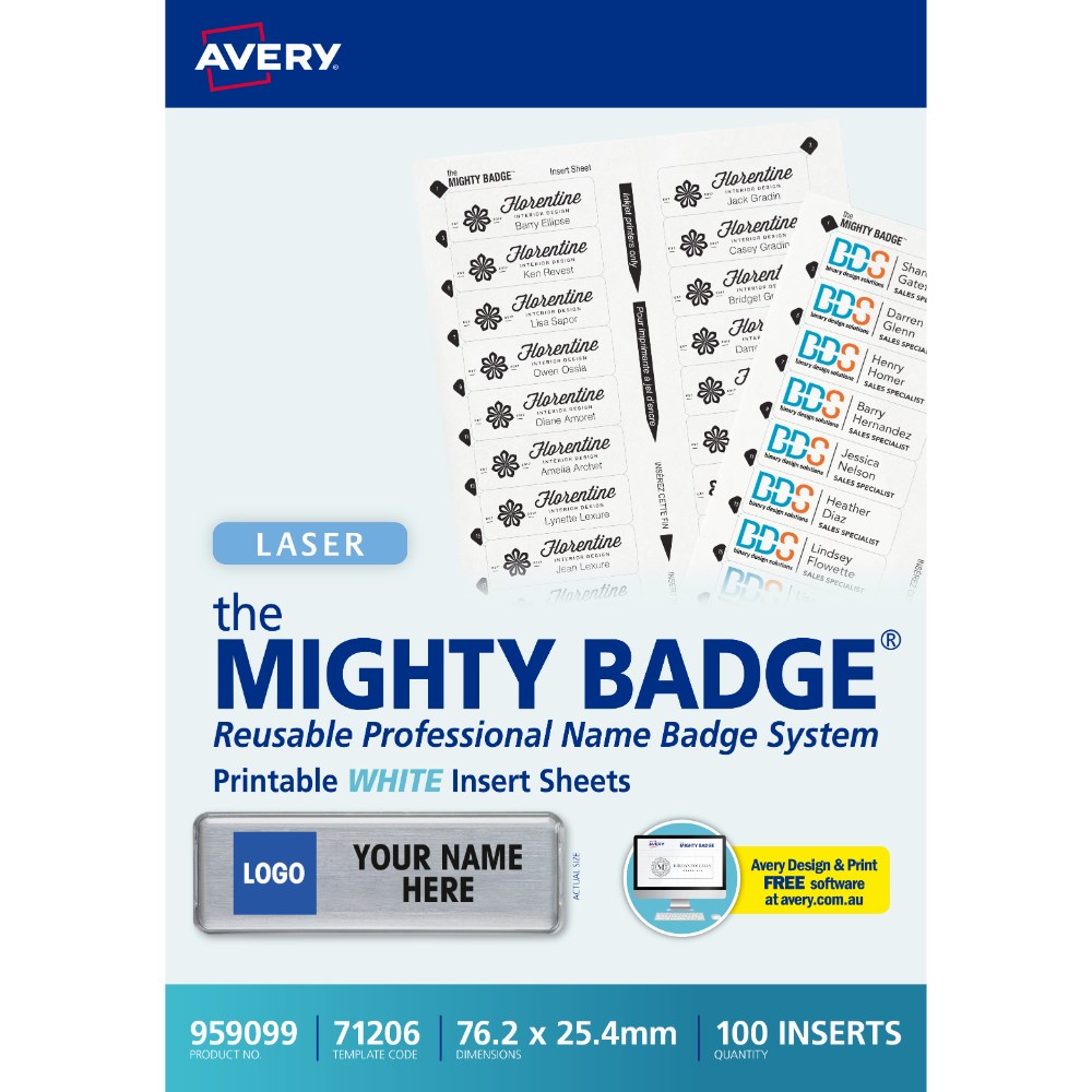 Avery Mighty Badge Printable Inserts Laser White 71206 76.2 x 25.4 mm 20UP 100 Inserts