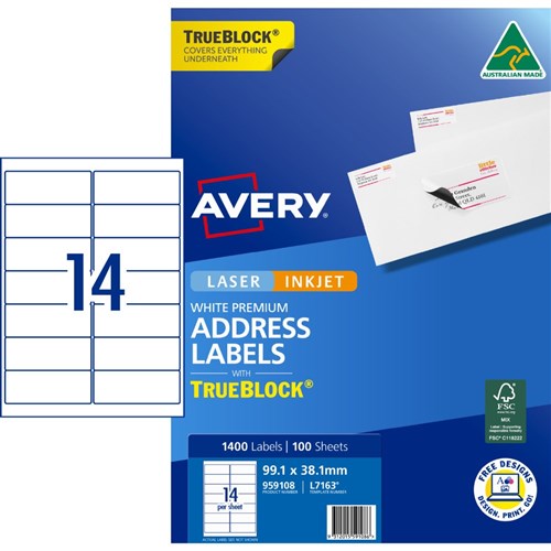 Avery Trueblock Address Labels Laser L7163 99.1 x 38.1mm 14UP 1400 Labels