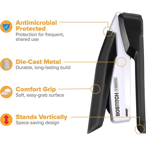 • Built-in Antimicrobial properties to protect from inhibiting the growth of bacteria on the stapler.