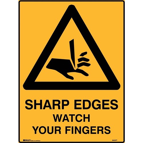 Brady Warning Safety Sign Sharp Edges Watch Your Fingers 450W x 600mmH Poly Yellow/Blk