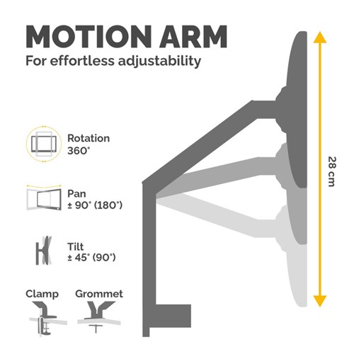 • Fully independent adjustable monitor arms, with 360 degrees rotation via innovative gas spring technology allowing for effortless movement.