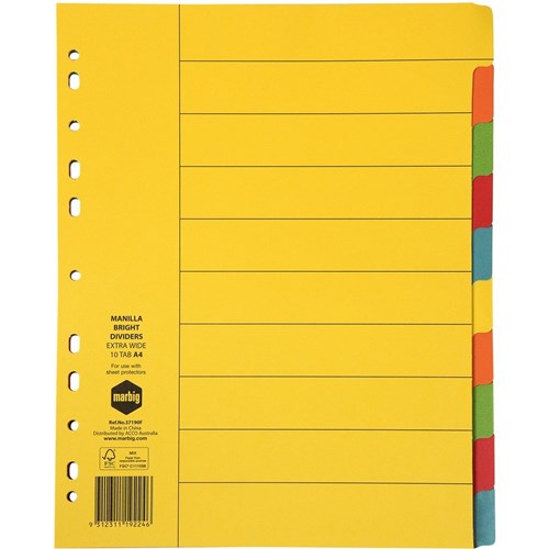 Marbig Manilla Indices & Dividers A4 Extra Wide 10 Tab Bright Colours